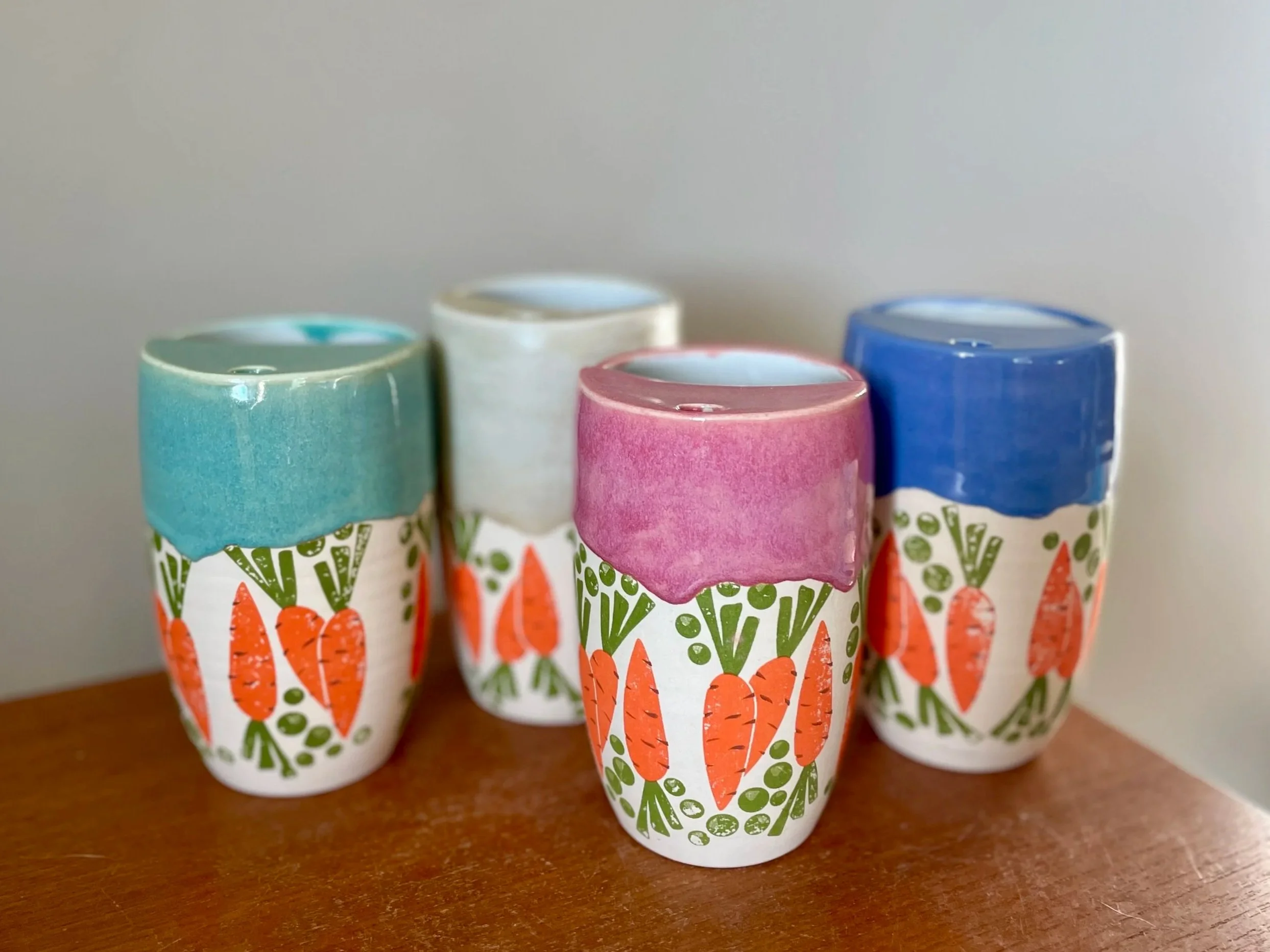 Handmade, wheel-thrown, adorned with carrots, and painted with glaze. Each cup has an integral "lid" that covers about half of the opening on the cup to reduce spilling or splashing for an on-the-go beverage, and a hole in the lid to sip through. This hole is also able to fit a standard straw into it if you like to sip with a straw. Choose between regular size (holds about 16-18 oz) or mini (holds about 8oz). Dishwasher and microwave safe. If you don't have a dishwasher or prefer to hand-wash, it would be easiest to clean the cup with one of those long-handled scrubbie brushes, as it may be difficult to fit your hand in the space left uncovered by the attached lid.